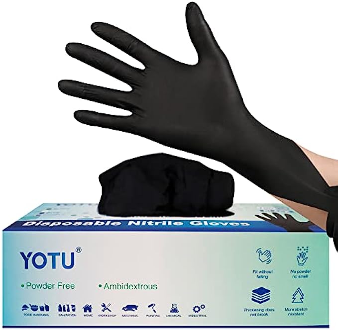 Pull On closure ?Unique Package and Design: Rolled cuff makes it easier and faster for opening, donning and removal. The Gloves hold the advantage of 6-mil thickness, plus the design of a Dispenser package which keeps inside clean and organized while providing easy access. ?Nonallergenic and Sanitary: Utilize skin-friendly non-latex material, which is perfect for people with latex allergies to wear trustingly. With the virtue of the single-use only gloves, it also features specialties of powder-free, ambidextrous and non-sterile. ?Multi-purpose: Not only are they suitable for medical exam, but also great for household cleaning, shopping, office, food handling and industries, and work as hard as possible. Easy pack for easy reach, gloves can be placed each places for home, bags and travel use. ?Durable and Fitted: More fitted than vinyl or latex gloves, please refer to the size chart before placing orders. Nitrile gloves come in medium, large and x-large for versatility. Long stretchy Black Nitrile Gloves with 10 inch length which make it hard to break. ?Customers First: If you are not satisfied with our products, feel free to contact us. We'll take full responsibility for the quality of them and try our best to solve your problems in time!